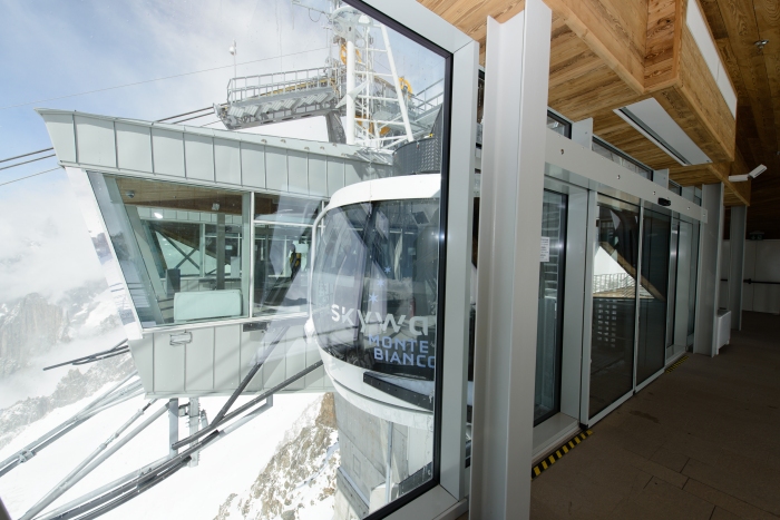 La “Skyway Monte Bianco” è un capolavoro ingegneristico unico al mondo. Il progetto deve la sua unicità alle tante innovazioni di natura tecnica, alle sfide che ha dovuto superare durante la costruzione ed alle peculiarità architettoniche. Tra queste figurano le moderne stazioni in vetro e acciaio, il concetto di sostenibilità finalizzato all’autonomia energetica e la capacità di trasporto, cui si aggiungono il fattore esperienziale dei viaggiatori, il volume dell’investimento pari a circa 120 milioni di euro ma soprattutto la realizzazione del progetto stesso.