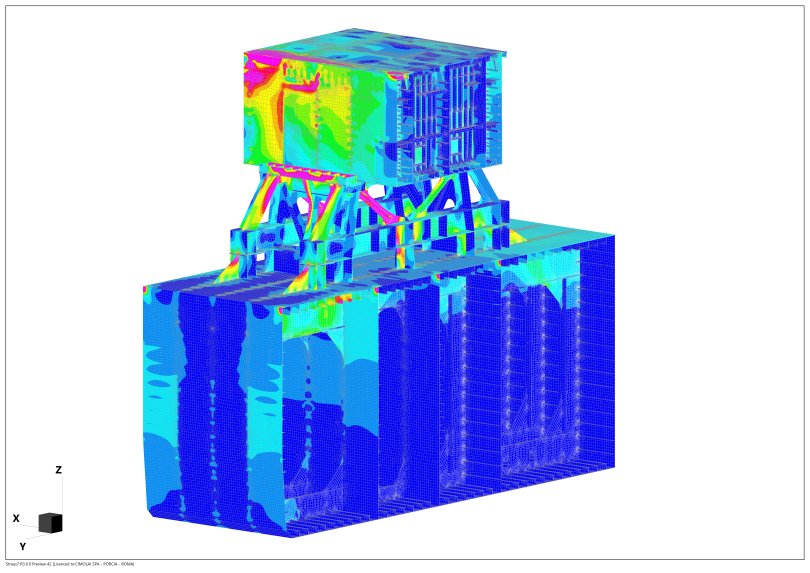Cimolai ha costruito le due travi piu' lunghe del mondo, ognuna del peso di 6700t e di 170m di lunghezza, compresa la coda (tail) di 26m incernierata alla trave, e progettato il grillage e il seafastening per il loro trasporto via mare da Monfalcone fino a Rotterdam. Le due travi sono le travi principali del Jacket Lift System (JLS), un innovativo sistema di installazione o rimozione dei jacket delle piattaforme off-shore. Il JLS e' in grado di movimentare in un solo sollevamento elementi fino a 20000t di acciaio e verra' installato a poppa sulla nave da costruzione Pioneering Spirt di Allseas, lunga piu' di 380m e larga 124m. Cimolai ha utilizzato il codice di calcolo Straus7 per realizzare i modelli FEM del grillage abbinati a modelli parziali della trave JLS e della gigantesca barge Iron Lady ed eseguire le analisi lineari e non lineari, che hanno permesso di verificare lo stato tensionale e deformativo con differenti combinazioni di carico nelle fasi di load-out e navigazione considerando per quest'ultima, onde di calcolo pari a 7.0m. Modelli locali con mesh piu' raffinata sono stati utilizzati per le verifiche strutturali di resistenza e di sbandamento e per le verifiche a fatica delle saldature delle robuste interfacce con la barge e con la trave JLS stessa. Testo, foto e immagine del modello di calcolo per gentile concessione di Cimolai Spa. |