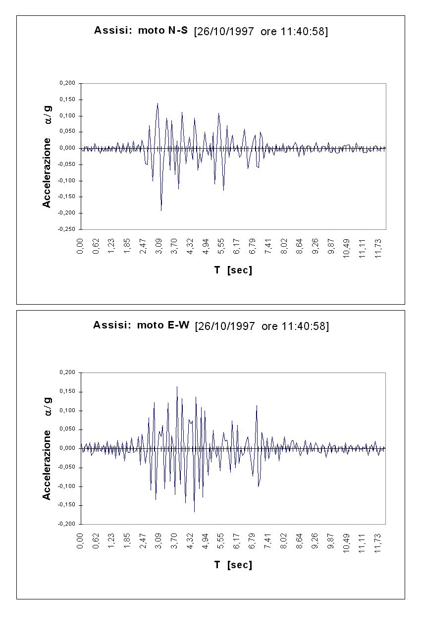 Utilizzando lo spettro di risposta elaborato per il sisma del 26 settembre 1997 relativamente alle due direzioni N-S e E-W e in funzione del valore del I periodo si sono determinate le accelerazioni massime (presumibili) agenti sugli elementi della Basilica Superiore durante il sisma; dalla Figura 5 si nota un’accelerazione massima in direzione N-S (ortogonale alla navata) pari a 0.6 g in corrispondenza del valore di picco, mentre un valore più basso si rileva per la componente in direzione E-W, 0.45 g, valori simili a quelli registrati dagli strumenti situati nella Basilica Inferiore.
