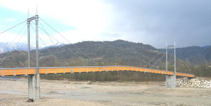 L’aspetto più delicato nella progettazione e nella realizzazione della struttura è stato quello di garantire un adeguato controventamento contro le azioni orizzontali. Infatti le dimensioni ridotte della larghezza dell’impalcato (2.50 m di luce netta percorribile) se rapportate con la luce dello stesso, inducono forti sollecitazioni nei tiranti d’acciaio che costituiscono la travata di controvento e che sono posizionati al lembo inferiore dell’impalcato stesso. L’eccentricità del sistema di controventamento rispetto all’asse delle travi principali causa inoltre un apprezzabile influenza delle azioni trasversali (vento) sul regime tensionale delle strutture longitudinali (travate e stralli). Le considerazioni sopra esposte hanno portato all’adozione di un sistema di traversi in tubolare metallico aventi il compito sia di sostenere l’orditura secondaria (tavolato e travetti), sia di raccogliere le sollecitazioni del controvento e trasferirle in asse alle travate principali. I traversi sono stati disposti a interasse 250cm e costituiscono anche la struttura di appoggio su pile e spalle.