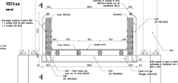 Ciascuna delle travate principali è stata suddivisa, per esigenze di montaggio e di trasporto, in cinque conci distinti giuntati tra loro con un sistema di piastre, spinotti e perni d’acciaio atto a ripristinare la sezione staticamente necessaria nella posizione del giunto. Il concio più lungo, quello centrale raggiunge una lunghezza di 27.25m. Si noti che in fase di montaggio tale giunzione è risultata particolarmente versatile consentendo la collocazione in opera dei soli due perni principali (f60)