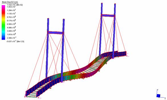 La progettazione statica della struttura ha richiesto una modellazione tridimensionale agli elementi finiti con analisi statica non lineare per simulare il comportamento a sola trazione degli stralli sia nelle fasi di montaggio che nella configurazione finale. Per la sola configurazione finale sono state studiate 47 combinazioni di carico comprendenti carichi termici, vento, sisma e le principali diverse disposizioni del carico accidentale. Nella modellazione si sono inoltre considerate ed opportunamente schematizzate tutte le eccentricità tra controventi, travi e stralli per poter valutare correttamente il regime tensionale delle singole parti.