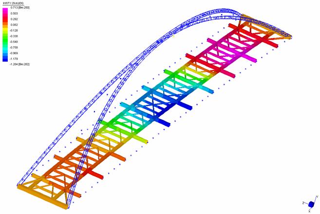 La figura rappresenta il modello di una passerella, realizzato in Straus7 utilizzando elementi tipo ‘beam’. Straus7 dispone di un ambiente di pre-processamento che consente di costruire in modo efficiente e veloce modelli quali quello di figura, e, attraverso il rendering, di verificarli.