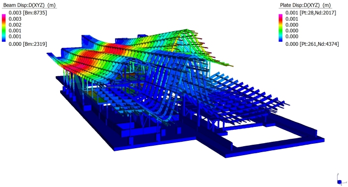 La copertura ha un’orditura principale in acciaio, sulla quale si appoggiano le travi curvilinee in legno; queste ultime comunemente chiamate “rafters”. Tutte le travi curvilinee, sia in acciaio che in legno, sono trasversalmente collegate dagli arcarecci, comunemente chiamati “purlin”. Si evincono nella figura sopra i rafter gialli in acciaio, i rafter verdi, i purlin blu, verdi e viola. I rafter sono cassoni di sezione 200x560mm; i purlin blu e verdi sono cassoni di sezione 200x460mm; i purlin viola sono cassoni di sezione 200x360mm. Le lamiere per la composizione dei cassoni sono generalmente di spessore 15mm; fanno eccezione le lamiere delle ali dei rafter gialli che hanno spessore 40mm. Hanno spessore 40mm anche le ali dei pulin verdi. Infine il purlin azzurro è composto da lamiere spessore 35mm. I rafter in legno hanno sezione 200x560mm, ad eccezione delle estremità dell’edificio dove hanno sezione 200x400mm. I purlin hanno sezione 200x460mm, ad eccezione delle campate d’estremità dove hanno sezione 200x340mm. |