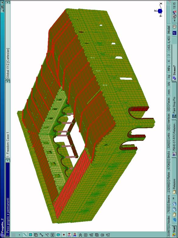 È stato definito un modello tridimensionale dell’intero fabbricato (Fig. 2–6), dotato di 31987 nodi, 783 elementi BEAM utilizzati per le colonne in pietra del chiostro dei tiranti in acciaio e per l’orditura lignea principale della copertura, 23298 elementi PLATE usati per le murature e 6706 elementi BRICK utilizzati per il rinfianco delle volte. Il legame costitutivo è stato definito in maniera differente per le diverse porzioni del manufatto, utilizzando opportunamente i tipi di materiale isotropo ed ortotropo.