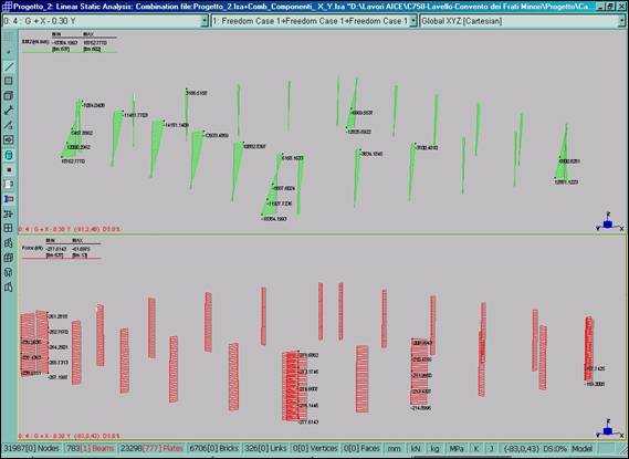 Sul modello è stata eseguita l’analisi statica lineare (Fig. 13–18) sotto l’azione del peso proprio strutturale, dei pesi permanenti portati, della neve e dei sovraccarichi variabili previsti dalla vigente normativa sulle costruzioni (D.M. 16.01.1996).