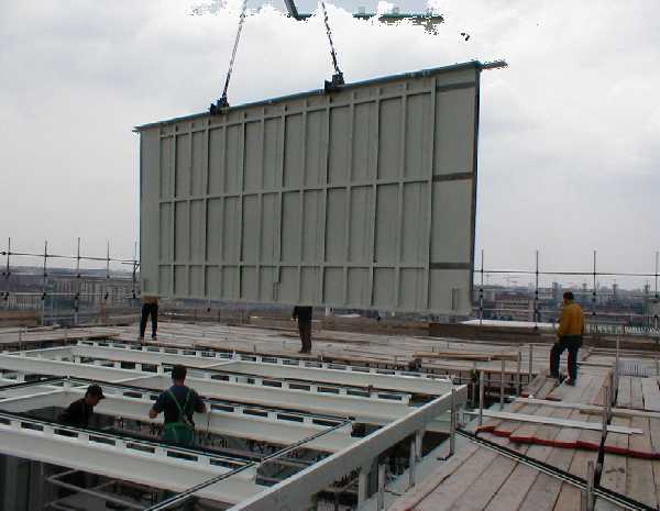 Le pareti laterali e la superficie di fondo sono formate da pannelli saldati di lamiera di grandi dimensioni. Sono stati previsti particolari sistemi regolabili di aggancio di tali pannelli alle strutture reticolari portanti, in grado di recuperare deformazioni e tolleranze e di rispettare le tolleranze, molto restrittive, di montaggio.
