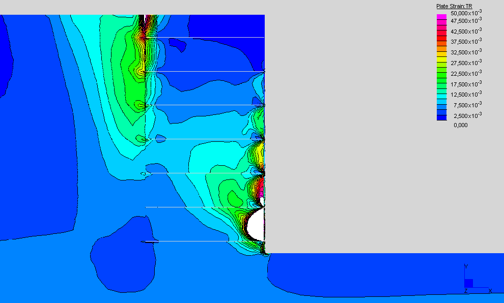 Aumentando la rigidezza dei chiodi di due ordini di grandezza (Rn = 10) non si fa più la formazione di una banda di taglio, rimangono tuttavia delle zone di terreno plasticizzato a tergo della zona chiodata dovute alla spinta ribaltante.