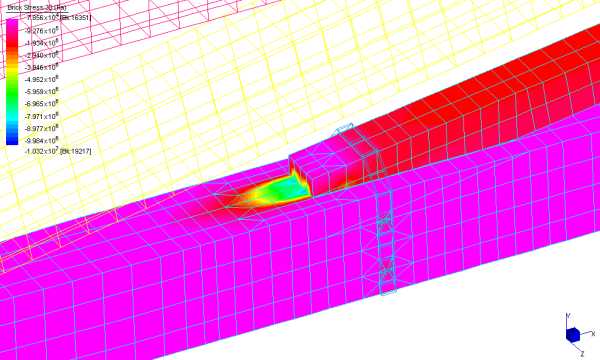 La modellazione con gli elementi beam non riesce a giustificare i dissesti rilevati nel nodo che hanno condotto alla diminuzione dell’area di contatto tra i denti del puntone e quelli della catena.