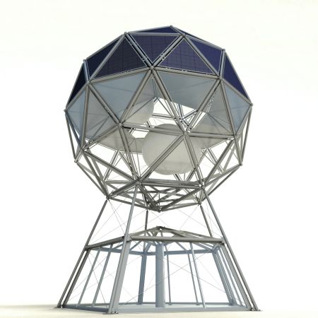 1. Breve descrizione - Diamante è il nome attribuito ad un prototipo di mini-centrale elettrica nella quale l’energia radiante solare viene trasformata in energia elettrica per mezzo di pannelli fotovoltaici opportunamente disposti sulla superficie di una sfera reticolare in acciaio posta ad una certa altezza dal suolo. La centrale ha la peculiarita', rispetto a un normale impianto fotovoltaico, di immagazzinare l'energia in appositi serbatoi sotto forma di ioni di idrogeno che alimentano batterie al litio. La sfera geodetica misura 4,0 m di raggio ed il suo centro è sostenuto a 7,63 m di altezza dal piano di imposta da una struttura reticolare sottostante all’interno della quale è situata la sala apparati. La sfera è formata da aste in acciaio inossidabile AISI 316L, di sezione circolare CHS 101.6x4 e lunghezza rispettivamente 2,472 m e 2,186 m, e da nodi sferici pieni di diametro 132 mm, in acciaio AISI 303. L’involucro del Diamante è costituito da 80 pannelli in vetro alloggiati nelle maglie triangolari del reticolo strutturale, di questi 38 saranno utilizzati per la produzione di energia mediante l’inserimento di celle fotovoltaiche nel materiale di interfaccia. Ciascun pannello è costituito da due lastre di vetro stratificato extralucido temperato chimicamente e spesso 10+6 mm, con interposto uno strato di PVB (polivinilbutirrale) di 1,52 mm di spessore.
