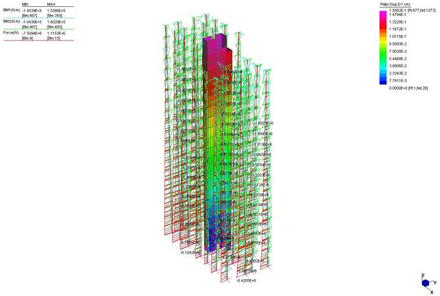 Il modello della torre è stato anche analizzato nel suo insieme con analisi della frequenza, per cercare le frequenze proprie di vibrazione.