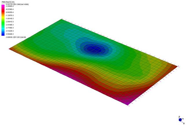 Per questo la platea è stata modellata con elementi finiti shell con supporto dovuto al terreno con Kw=100 Mpa/m (10 kg/cm3).