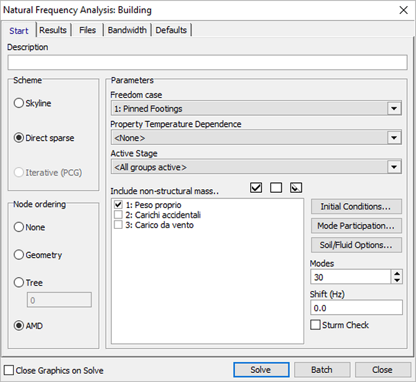 Il menu di controllo del solutore spettrale contiene numerose funzioni utili per lo svolgimento dell’analisi sismica modale, quali: