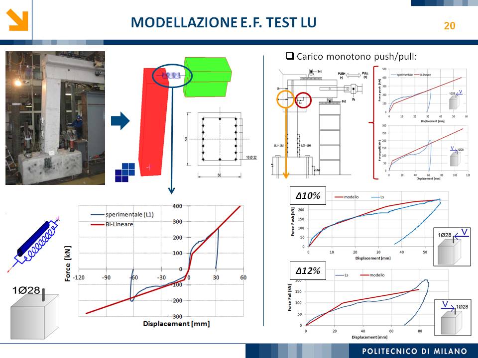 L’obiettivo dello studio presentato è qualificare e quantificare i parametri caratteristici del comportamento sismico, in termini di spostamento, resistenza, rigidezza e duttilità, delle connessioni a spinotto trave – colonna correntemente impiegate nelle strutture industriali prefabbricate. Queste connessioni sono tipicamente costituite da barre di acciaio ancorate nel pilastro e passanti in appositi alloggiamenti della trave, successivamente annegati con malta, in modo da garantire un comportamento pressoché a cerniera nel piano verticale e un comportamento rigido nel piano orizzontale. Nella tesi è riportata un’analisi parametrica relativa alle formulazioni attualmente presenti in letteratura per la valutazione della resistenza di tali connessioni, al fine di sottolineare pregi e difetti di ognuna. Viene inoltre presentata la procedura necessaria a caratterizzare il comportamento del collegamento in termini di forza-spostamento, sia a snervamento sia a rottura, mediante curva “Bi-Lineare” e “Tri-Lineare”. Tali procedure sono verificate attraverso una campagna sperimentale, realizzata nell’ambito del progetto di ricerca Europeo SAFECAST, di cui si riportano i set up delle prove e i risultati ottenuti per storie di carico sia monotono sia ciclico; i test sono stati condotti fino allo spostamento ultimo, in modo da determinare, in maniera dettagliata, la curva forza-spostamento caratterizzante la connessione. La definizione “Bi-Lineare” e “Tri-lineare” del comportamento del collegamento spinottato è stata applicata nella modellazione ad elementi finiti di due strutture prefabbricate monopiano ad uso industriale, simmetrica e non, realmente esistenti. Su tali strutture sono state condotte analisi dinamiche non lineari, Time History, al fine di evidenziare la differente risposta, da parte dell’edificio soggetto a sisma, tra l’innovativa modellazione della connessione spinottata con elementi “Beam Spring” e il classico vincolo a semplice cerniera, attualmente adottato nella comune pratica progettuale. Lo studio presentato cerca di colmare le lacune nella conoscenza del comportamento sismico delle connessioni spinottate trave-colonna, promuovendo lo sviluppo di strumenti numerici appropriati, attendibili e verificati sperimentalmente, da utilizzare nella progettazione di strutture prefabbricate in zone sismica sfruttando le proprietà delle stesse connessioni. Il software utilizzato per le modellazioni FEM e' il codice di calcolo Straus7. |