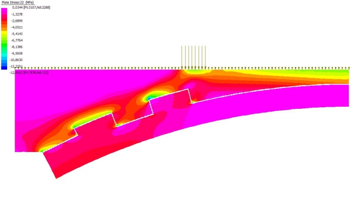 L’analisi dell’aspetto più particolare e forse interessante del ponte è rappresentata dallo studio della collaborazione tra l’arco in muratura e la nervatura in calcestruzzo presente sopra lo stesso (Figura 1), agevolata dalla presenza di due denti in muratura. Con il software Straus7 è stato creato un modello ad elementi plate ed elementi beam di tipo point contact (Figure 2 e 3), con cui è stata effettuata un’analisi quasi-statica volta a studiare il meccanismo sottoposto ai fenomeni lenti di ritiro e viscosità differita, eseguendo il confronto tra due differenti modelli ad elementi finiti (Figura 4). In secondo luogo è stata eseguita un’analisi non-lineare con i carichi previsti dalle NTC 2008 (Figura 5), confrontando infine i risultati con un terzo modello più affinato (Figure 6 e 7).