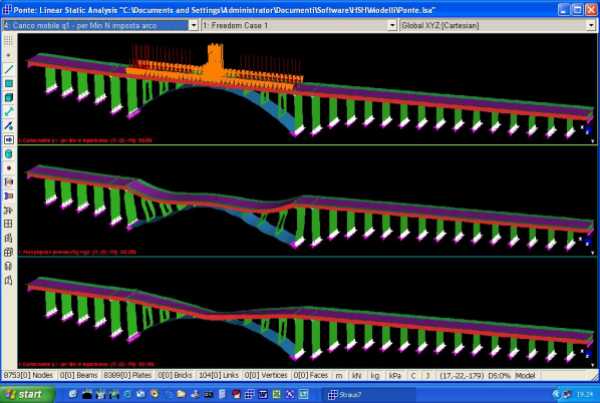 Fig. 2 – Analisi statica lineare: configurazione di riferimento e carichi mobili di normativa,