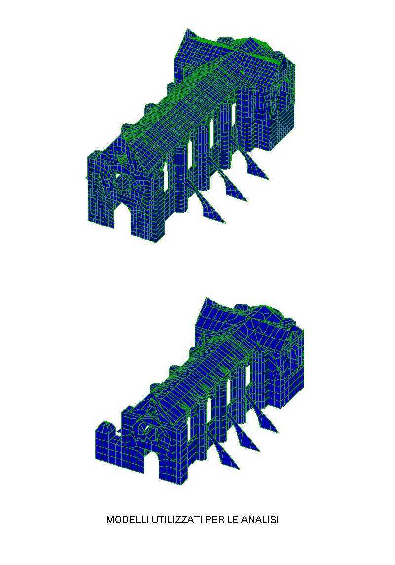 Si sono utilizzati elementi plateshell per schematizzare la muratura perimetrale, gli archi rampanti esterni, le volte e la copertura in latero-cemento; elementi beam per i pilastri a fascio interni, i cordoli delle volte e le travi in c.a. della copertura; elementi brick isotropi per il materiale di rinfianco delle volte e masse concentrate per il materiale di riempimento (incoerente).