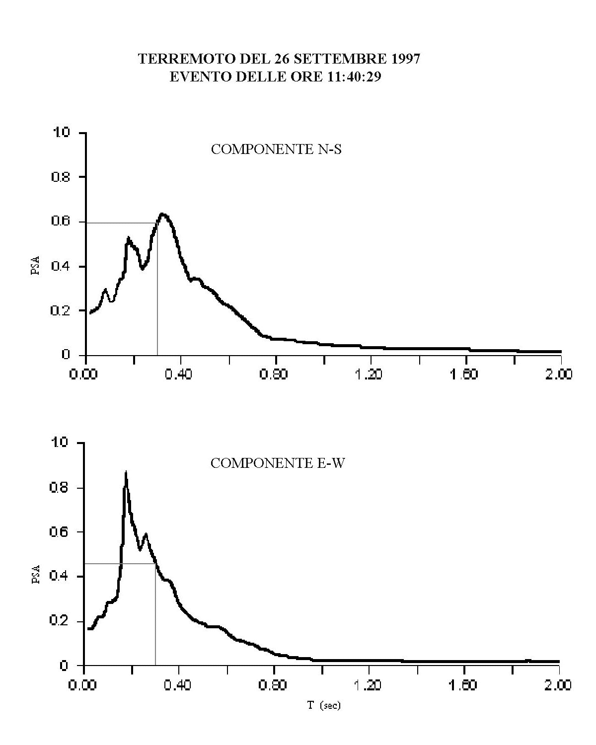 Utilizzando lo spettro di risposta elaborato per il sisma del 26 settembre 1997 relativamente alle due direzioni N-S e E-W e in funzione del valore del I periodo si sono determinate le accelerazioni massime (presumibili) agenti sugli elementi della Basilica Superiore durante il sisma; dalla Figura 5 si nota un’accelerazione massima in direzione N-S (ortogonale alla navata) pari a 0.6 g in corrispondenza del valore di picco, mentre un valore più basso si rileva per la componente in direzione E-W, 0.45 g, valori simili a quelli registrati dagli strumenti situati nella Basilica Inferiore.