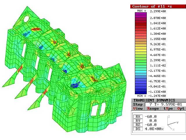 E stata svolta quindi una analisi dinamica sul modello tridimensionale, applicando come storia di carico gli accelerogrammi rilevati durante il sisma (Figura 6), per determinare il grado di sollecitazione nei punti più critici della Basilica, come l’imposta delle volte e gli archi trasversali che reggono le vele.