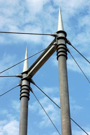 Ciò si è reso possibile assemblando e piè d’opera i cinque conci di impalcato e studiando 9 diverse fasi costruttive a partire dal montaggio dei portali reggistralli fino alla configurazione finale della struttura. Seguendo tali fasi, giocando sulla tesatura degli stralli e misurando in continuo le deformazioni mediante un distanziometro laser di alta precisione puntato su mirini appositamente collocati nei punti critici della struttura, si è proceduto fino al completamento del montaggio.