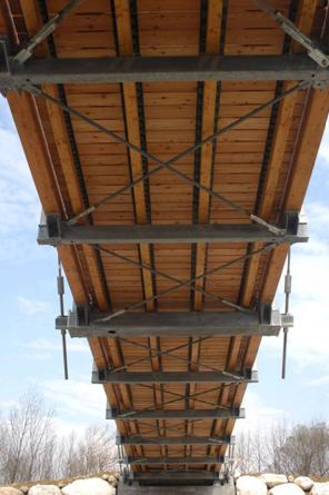 L’aspetto più delicato nella progettazione e nella realizzazione della struttura è stato quello di garantire un adeguato controventamento contro le azioni orizzontali. Infatti le dimensioni ridotte della larghezza dell’impalcato (2.50 m di luce netta percorribile) se rapportate con la luce dello stesso, inducono forti sollecitazioni nei tiranti d’acciaio che costituiscono la travata di controvento e che sono posizionati al lembo inferiore dell’impalcato stesso. L’eccentricità del sistema di controventamento rispetto all’asse delle travi principali causa inoltre un apprezzabile influenza delle azioni trasversali (vento) sul regime tensionale delle strutture longitudinali (travate e stralli). Le considerazioni sopra esposte hanno portato all’adozione di un sistema di traversi in tubolare metallico aventi il compito sia di sostenere l’orditura secondaria (tavolato e travetti), sia di raccogliere le sollecitazioni del controvento e trasferirle in asse alle travate principali. I traversi sono stati disposti a interasse 250cm e costituiscono anche la struttura di appoggio su pile e spalle.