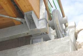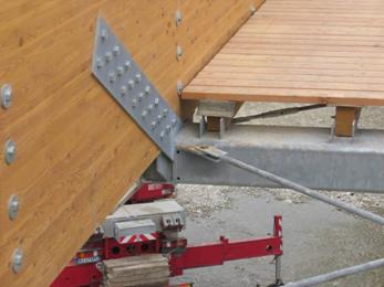 Gli stralli si dividono in stralli primari (f44) e secondari (f32) per il diverso impegno statico a cui sono sottoposti e si connettono ad alcuni traversi opportunamente modificati per ospitare il sistema di tesatura degli stralli stessi. In tali traversi, denominati “traversi reggistralli”, si è anche resa necessaria la progettazione di un opportuno sistema di diffusione delle ingenti forze scaricate dagli stralli sulle travate principali. Tali giunzioni sono particolarmente delicate in quanto connettono elementi strutturali costituiti da materiali di caratteristiche sensibilmente diverse: il legno lamellare, l’acciaio da carpenteria e l’acciaio armonico delle funi.