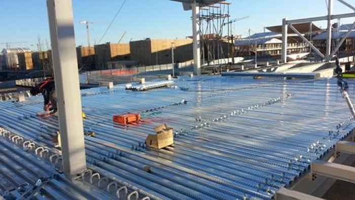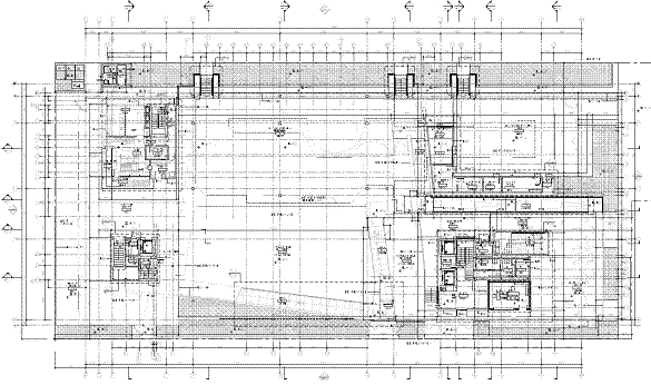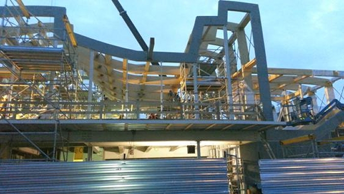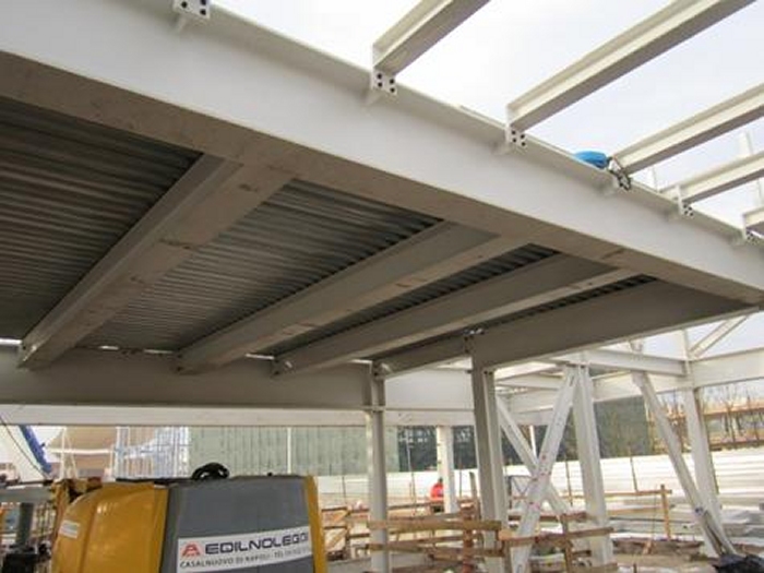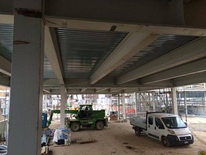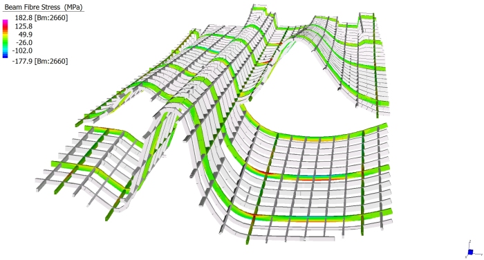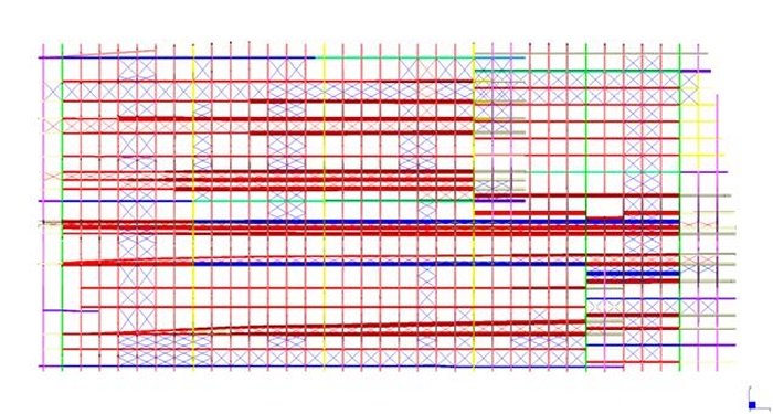 Le elevazioni sono a telaio con controventi a croce e controventi a “V”. Le colonne sono in profili HEM220, HEM300, tubi 200x200x12, tubi 150x150x12.5 . I controventi sono in profili UPN180 singoli quando sono a croce, ed UPN180 doppi quando sono a “V”. Quando a vista, i controventi sono in fune d’acciaio diametro 20mm. Gli impalcati sono a graticcio di travi HEA300, HEA340, HEA550 e HEB800. Nella figura sopra si colgono in colore azzurro le colonne HEM300, in colore blu le colonne HEM220, in colore rosso e verde le colonne in tubi 200x200x12mm. I controventi UPN180 sono in grigio. Le travi di impalcato HEA300 sono in azzurro, le HEA340 in verde, le HEA550 in giallo e le HEB800 in arancione Gli impalcati hanno lamiera grecata con getto collaborante in calcestruzzo armato; le travi sono tutte piolate. |