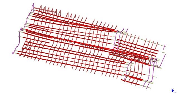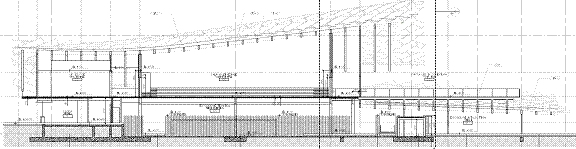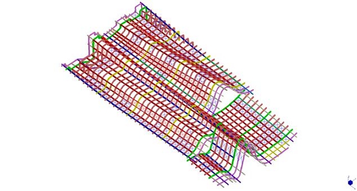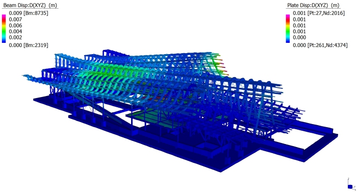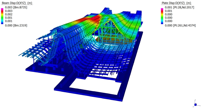 La copertura ha un’orditura principale in acciaio, sulla quale si appoggiano le travi curvilinee in legno; queste ultime comunemente chiamate “rafters”. Tutte le travi curvilinee, sia in acciaio che in legno, sono trasversalmente collegate dagli arcarecci, comunemente chiamati “purlin”. Si evincono nella figura sopra i rafter gialli in acciaio, i rafter verdi, i purlin blu, verdi e viola. I rafter sono cassoni di sezione 200x560mm; i purlin blu e verdi sono cassoni di sezione 200x460mm; i purlin viola sono cassoni di sezione 200x360mm. Le lamiere per la composizione dei cassoni sono generalmente di spessore 15mm; fanno eccezione le lamiere delle ali dei rafter gialli che hanno spessore 40mm. Hanno spessore 40mm anche le ali dei pulin verdi. Infine il purlin azzurro è composto da lamiere spessore 35mm. I rafter in legno hanno sezione 200x560mm, ad eccezione delle estremità dell’edificio dove hanno sezione 200x400mm. I purlin hanno sezione 200x460mm, ad eccezione delle campate d’estremità dove hanno sezione 200x340mm. |