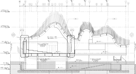L’edificio ha una pianta rettangolare dimensioni 35.0x74.0m e copertura curvilinea che raggiunge quota massima 17.0m. Le seguenti figure illustrano la complessa geometria dell’edificio. |