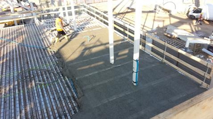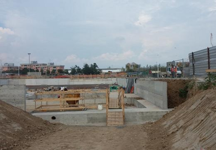 Le fondazioni sono di tipo superficiale: platea spessore costante 600mm e travi di sezione 450x600mm e 3000x600mm; l’estradosso delle fondazioni si attesta a quota -1.950m. Pareti in calcestruzzo armato spessore 300mm e pilastri sezione 750x750mm si elevano fino a quota -0.300m |