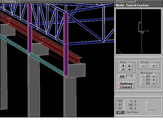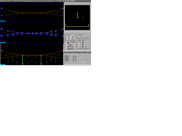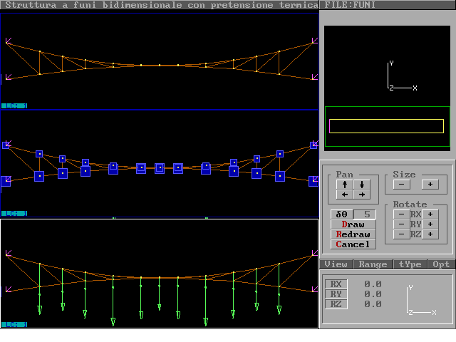 Fig. 10. Studio di una trave di funi. La sequenza di assegnazione dei dati prevede lo schema della struttura a riposo, l'applicazione della presollecitazione con la determinazione della conseguente configurazione di equilibrio, e successiva applicazione dei carichi. I problemi legati all'ipostaticità della struttura sono superati automaticamente.