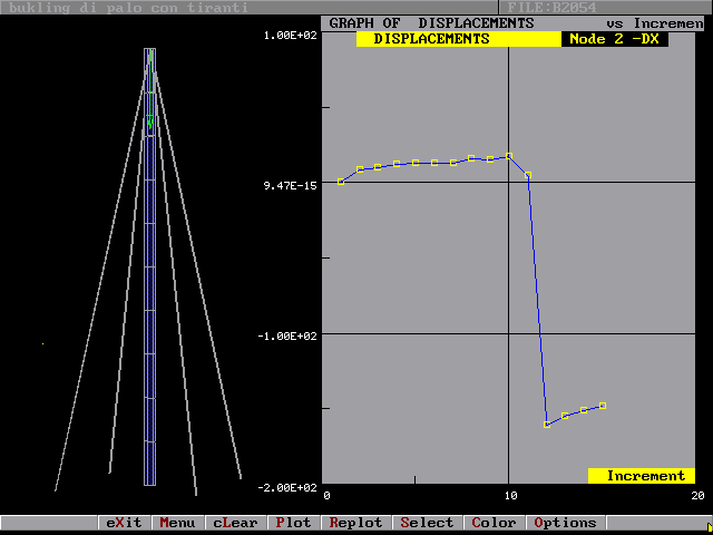 Fig. 14. Studio del comportamento di un'antenna strallata: risposta non lineare sino al raggiungimento del carico critico; ripresa di rigidezza in fase post-critica.