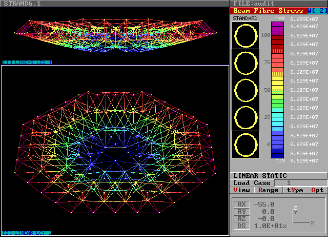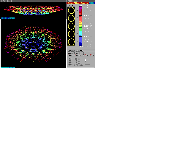 Dove si ha, poi, l'impressione di trovarsi di fronte ad uno strumento effettivamente completo e potente, è quando si passa all'analisi. Si possono svolgere, oltre alle più tradizionali analisi della risposta statica, analisi di tipo modale, analisi dinamiche nel dominio delle frequenze (risposte armoniche), analisi di buckling (tenendo conto di eventuali stati di coazione, anche termica), analisi termomeccaniche, analisi di trasporto del calore. L'impostazione può essere lineare e non-lineare, ed, in quest'ultimo caso, includere non-linearità per materiale, o di tipo geometrico, anche riferite alle condizioni al contorno . In campo dinamico l'analisi può essere svolta, anche in condizioni non lineari, nel dominio del tempo, e, quindi, studiando i transitori. Con la stessa facilità possono essere affrontati problemi di campo, quali i moti di filtrazione, il moto dei fluidi a potenziale, la conduzione elettrica, la diffusione dei gas, ed, ancora, problemi di elettrostatica, di lubrificazione, etc. Quando, infine, svolta l'analisi la si vuole documentare, e si vuole comprendere la qualità dello studio portato a termine ed il suo significato rispetto al problema strutturale affrontato, si può ben apprezzare la ricchezza e l'efficienza dei post-processori. Oltre a forme di documentazione standard dei risultati (listati e diagrammi) - la cui libertà di utilizzo è, però, amplissima, con la possibilità di personalizzare a piacere le relazioni di calcolo - è disponibile una varietà di rappresentazioni grafiche sintetiche: viste in contour cromatici o wireframe con rappresentazione sulla struttura deformata od indeformata delle grandezze calcolate (spostamenti, tensioni, etc, persino all'interno delle sezioni descritte in forma monodimensionale!); diagrammi dei parametri della sollecitazione; rappresentazione, con vettori intensità, di variabili meccaniche o di campo; e simili. Infine - e con caratteristiche assolutamente uniche in questo tipo di softwares - le viste con animazione dei risultati del problema permettono una comprensione estremamente chiara dello stesso: non si tratta, solamente, di dare una rappresentazione animata ad esempio delle forme di vibrazione propria di una struttura, ma di vedere anche il progredire dello stato di tensione (in una rappresentazione a campo) con il crescere della sollecitazione, o di seguire la deformazione di una struttura in un problema di grandi spostamenti. Se a tutto questo si accompagna una diagnostica adeguata ed una documentazione veramente completa , sia sotto il profilo dei metodi, che degli accorgimenti applicativi degli stessi, si può ben dire che lo strumento di analisi consegue, come forse nessun altro a questo livello, l'obiettivo di mettere effettivamente nelle mani del progettista tutta la potenza di un metodo cui si lega oggi - e da cui dipenderà molto nel futuro - l'individuazione di scelte progettuali ottimali, e la loro documentazione.