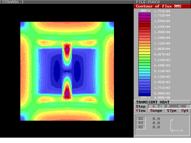 Fig. 9. Analisi della resistenza al fuoco di una colonna di acciaio (HEB) protetta con un getto di calcestruzzo. Nella figura è rappresentato l'andamento del flusso termico misurato come radice quadrata della somma dei quadrati dei diversi contributi.