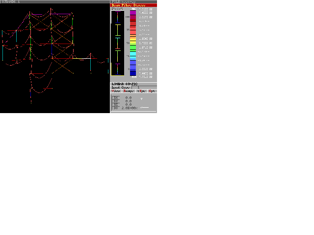 Fig. 6. Struttura reticolare spaziale. Nella stessa schermata possono essere evidenziate la configurazione deformata (con uso del colore per facilitare la lettura degli spostamenti) e lo stato tensionale, asta per asta, con distribuzione delle tensioni all'interno di sezioni predefinite.
