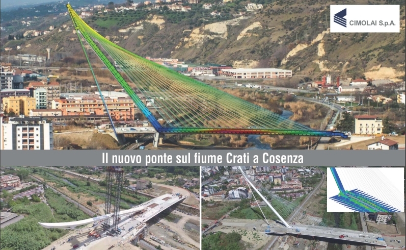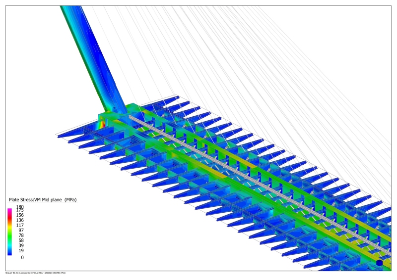 Il ponte sul fiume Crati a Cosenza, realizzato da CIMOLAI SPA, e' fortemente caratterizzato da un'antenna d'acciaio a sezione pseudo ellittica, alta ottantotto metri e inclinata di cinquantuno gradi, incastrata all'impalcato di acciaio lungo centoventicinque metri e largo ventiquattro. La peculiarita' dell'antenna, oltre alla forma, e' costituita dal suo strallo di ammarro, posizionato nel piano longitudinale contenente l'asse impalcato e l'asse antenna. L'impalcato e' costituito da un cassone centrale torsio-resistente e, dai due lati, da sbalzi cadenzati ogni due metri e mezzo atti a sorreggere le carreggiate, ultimate con una soletta di calcestruzzo. Infine il complesso di quaranta stralli simmetrici, anteriori e posteriori, con geometria ad arpa conchiudono la statica dell'opera sulla pila di calcestruzzo e le spalle. E' stato realizzato un modello FEM di calcolo Straus7 comprensivo di pennone, impalcato e cavi, non solo per il calcolo degli stati di esercizio, ma anche per la simulazione, per mezzo della stage analysis, di tutte le fasi di montaggio del ponte, permettendo l'accurata verifica dell'effetto delle situazioni transitorie sulla resistenza strutturale, degli elementi e dei dettagli. Il comando morph, in particolare, ha reso possibile in automatico la delicata descrizione del passaggio tra schemi statici differenti compreso il getto della soletta in calcestruzzo. Sia l'impalcato che il pennone sono stati modellati con elementi di tipo plate, includendo la presenza degli irrigidimenti interni. Le analisi di dettaglio dei nodi sono quindi state svolte direttamente nel modello globale calcolando le tensioni locali in esercizio e durante il transitorio. La pretensione da attribuire ai cavi per raggiungere lo stato deformativo finale desiderato e' stata determinata per mezzo di un codice personalizzato realizzato con l'API (Application Program Interface) di Straus7. |