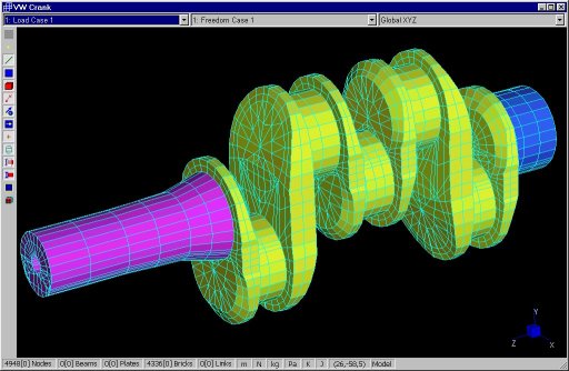 Albero a gomiti per un motore a combustione interna a 4 cilindri. Questo tipo di mesh può essere realizzata in Straus7 utilizzando gli strumenti di manipolazione degli elementi. Dopo aver meshato separatamente ogni parte, si assembla la mesh completa con le funzioni di taglia-copia-incolla. Per modellare i supporti, sono state applicate le condizioni di vincolo in sistemi di coordinate cilindrici definiti dall'utente.