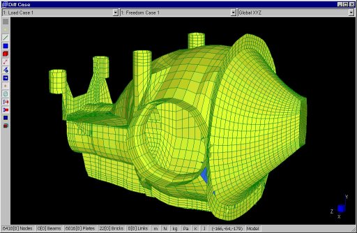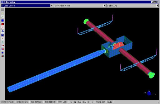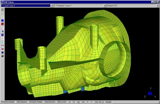 Scatola del differenziale di un'automobile a trazione posteriore. Il solutore delle frequenze viene utilizzato per conoscere i modi propri di vibrare. Questi hanno un ruolo importante nella progettazione dell'alloggiamento dei meccanismi, in quanto occorre ridurre la possibilita' di risonanze, che sarebbero causa di eccessivo rumore.