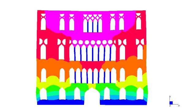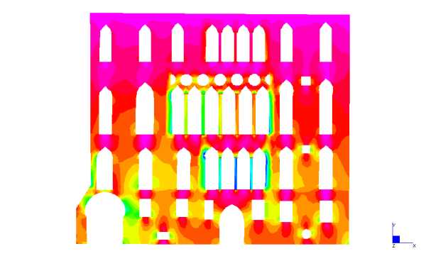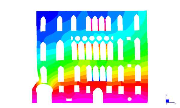 In particolare il calcolo delle strutture, condotto da Iconia Ingegneria Civile, si è avvalso di modellazioni numeriche in grado di evidenziare stati tensionali e deformativi della struttura permettendo di valutare la risposta dell’edificio agli interventi previsti. Il codice di calcolo usato è Straus7. I modelli sono stati creati utilizzando elementi plate per le pareti ed elementi beam per le colonne in pietra.