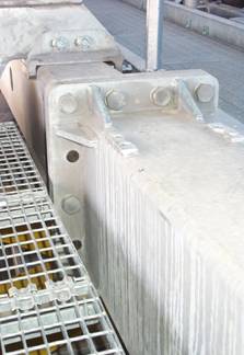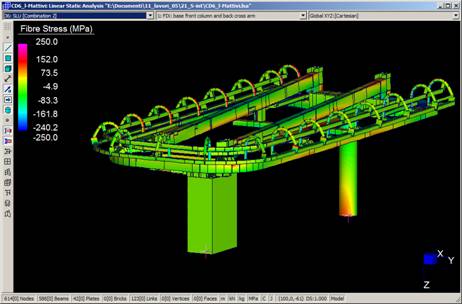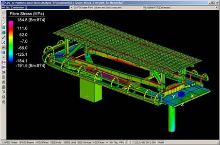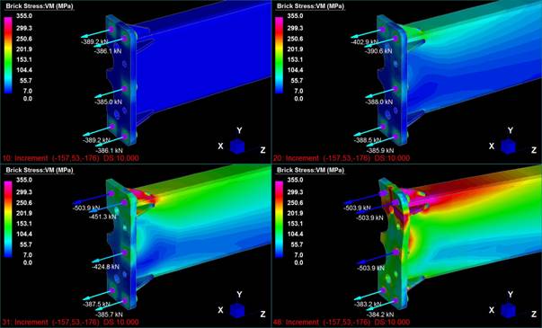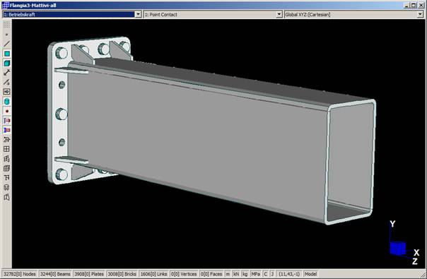 Le stazioni degli impianti di risalita di ultima generazione del Leitner Group, seggiovie e cabinovie ad ammorsamento automatico, denominate LPA, sono progettate e verificate come strutture intelaiate. In particolare il modello in Straus7 delle stazioni è realizzato perlopiù con elementi trave del tipo beam2. Alcuni dettagli costruttivi di particolare importanza o complessità sono studiati separatamente. I modelli FEM vedono l’uso di elementi plate, brick, e point contact beams, e sono risolti con linear buckling analysis e nonlinear static analysis È questo il caso del giunto trave-trave con flangia d’estremità e bulloni ad alta resistenza precaricati, realizzato nelle due travi longitudinali principali di stazione (tubi formati a caldo 500x300x16 in acciaio S355, piastre da 30mm in acciaio S355 , bulloni M30 cl.10.9 e spine f35 in acciaio 42CrMo4).