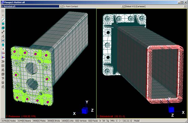Punti di distacco flangia (in rosa a sinistra); forze sui bulloni (a destra)