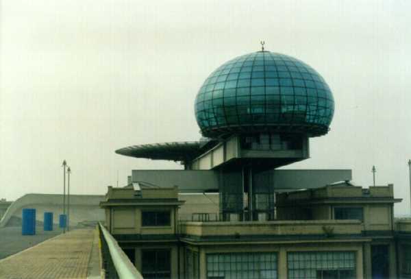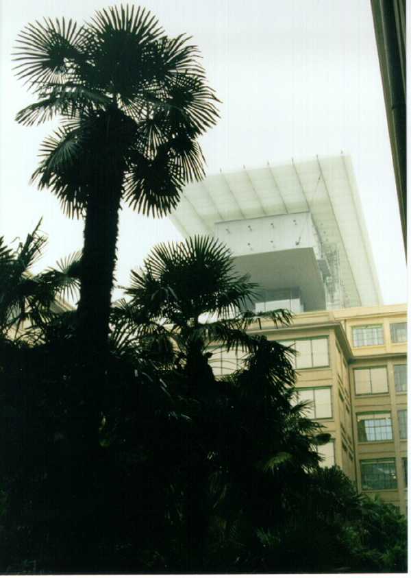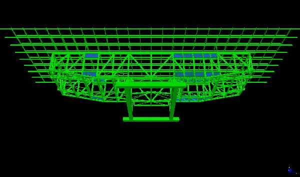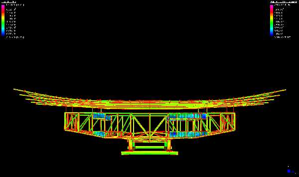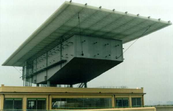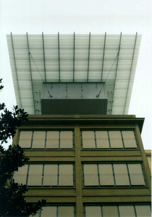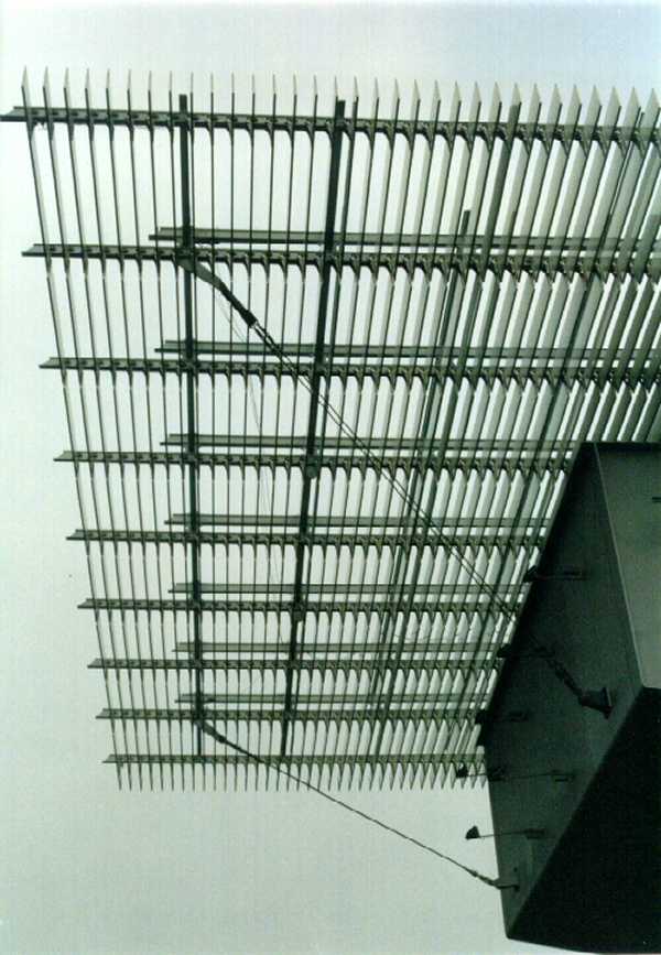 Il grande pannello frangisole superiore ha una struttura a graticcio piano, formata da 2 serie di tubi rettangolari ortogonali tra loro e solidarizzati con saldatura nei punti di incrocio. Per ridurre la deformabilità nei riguardi delle azioni dinamiche dovute al vento, il pannello è ancorato in 8 punti con cavi pretesi alla sottostante struttura della sala mostre. L’entità delle pretensioni è tale da evitare che i cavi vadano "in bando" anche nelle condizioni più sfavorevoli di azione del vento.