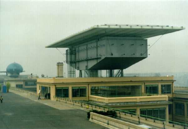 Nell’ambito della ristrutturazione dell’ex fabbricato industriale del Lingotto a Torino, è stata prevista una serie di trasformazioni funzionali ed architettoniche dello stesso. In corrispondenza del lato nord, è stato progettato l’inserimento di una serie di spazi adibiti a Pinacoteca ed in particolare la realizzazione di una sala mostre collocata in un contenitore sopraelevato rispetto al fabbricato stesso. La sala ha forma di un parallelepipedo, rastremato alle estremità, con dimensioni in pianta di circa 10 x 37 m ed altezza variabile da 7,5 m nella parte centrale a 4,5 m alle estremità circa ed appoggia sul fabbricato sottostante su 4 pilastri con sezione a croce d’acciaio, di 2 m circa d’altezza. I pilastri sono posizionati ai vertici di un rettangolo di 9,6 x 8,5 m e la sala presenta quindi 2 sbalzi di circa 14,25 m per parte.