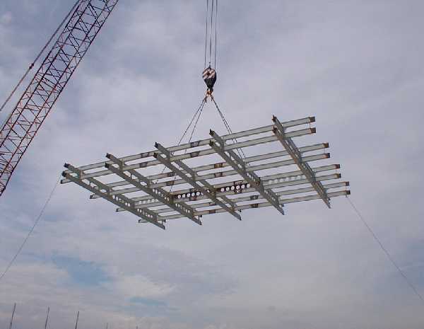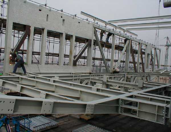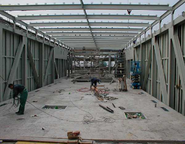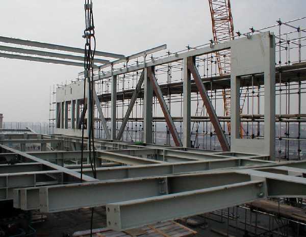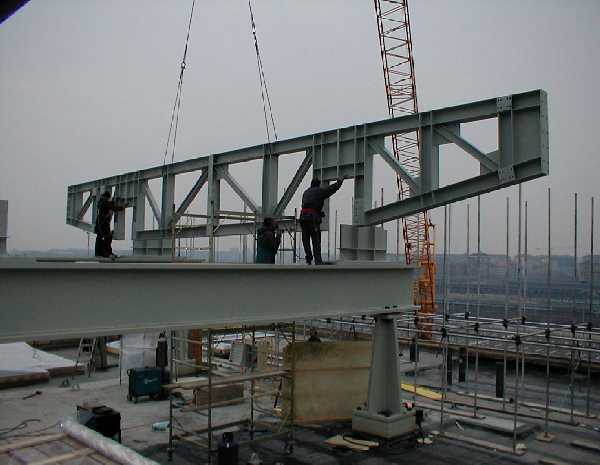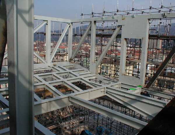 Inferiormente è presente una struttura formata da travi a cassone d’acciaio, con forma ad H, per consentire il raccordo tra i pilastri di acciaio di sostegno della sala ed i pilastri in calcestruzzo armato del fabbricato sottostante, opportunamente rinforzati per sostenere i nuovi carichi.