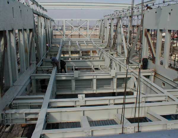 Le pareti laterali e la superficie di fondo sono formate da pannelli saldati di lamiera di grandi dimensioni. Sono stati previsti particolari sistemi regolabili di aggancio di tali pannelli alle strutture reticolari portanti, in grado di recuperare deformazioni e tolleranze e di rispettare le tolleranze, molto restrittive, di montaggio.