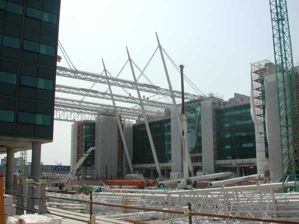 Ogni trave principale appoggia sui corpi dell’ edificio e, nella parte mediana, è sostenuta da due piloni d’acciaio a sezione tronco-conica che, inclinati di 71.34° rispetto l’orizzontale, raggiungono la quota + 44.55 m.