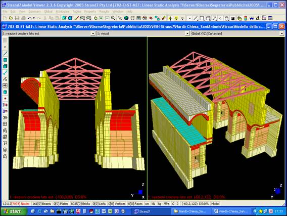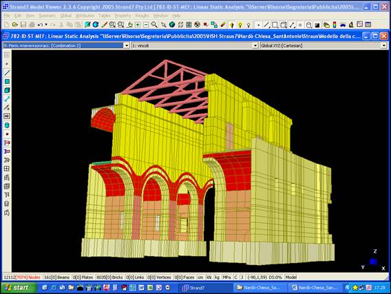 È stato definito un modello tridimensionale dell’intera chiesa (Fig. 2 e 3), dotato di 12112 nodi, 161 elementi BEAM per le capriate lignee e 8035 elementi BRICK a 8 nodi (tipo HEXA8) per le murature. Il legame costitutivo è stato definito in maniera differente per le diverse porzioni del manufatto. In particolare, per i paramenti murari, per i nuclei dei pilastri e per le volte, è stato definito un materiale elastico lineare ortotropo di modulo elastico in direzione verticale (Ez) pari al doppio di quello nelle due direzioni trasversali (Ex = Ey). Lo strato interno dei pannelli murari è stato schematizzato con un materiale di caratteristiche meccaniche inferiori. Infine, sono stati definiti altri materiali, di basso modulo elastico, per modellare il materiale sciolto del riempimento delle volte, la muratura di fondazione ed il legno delle capriate.