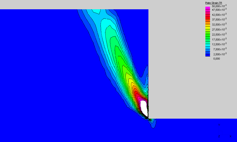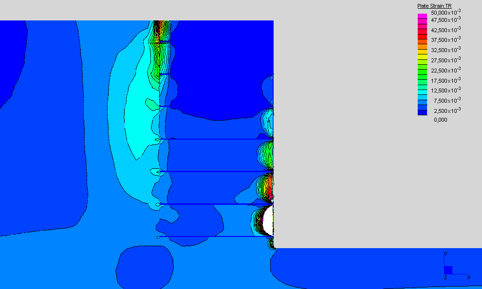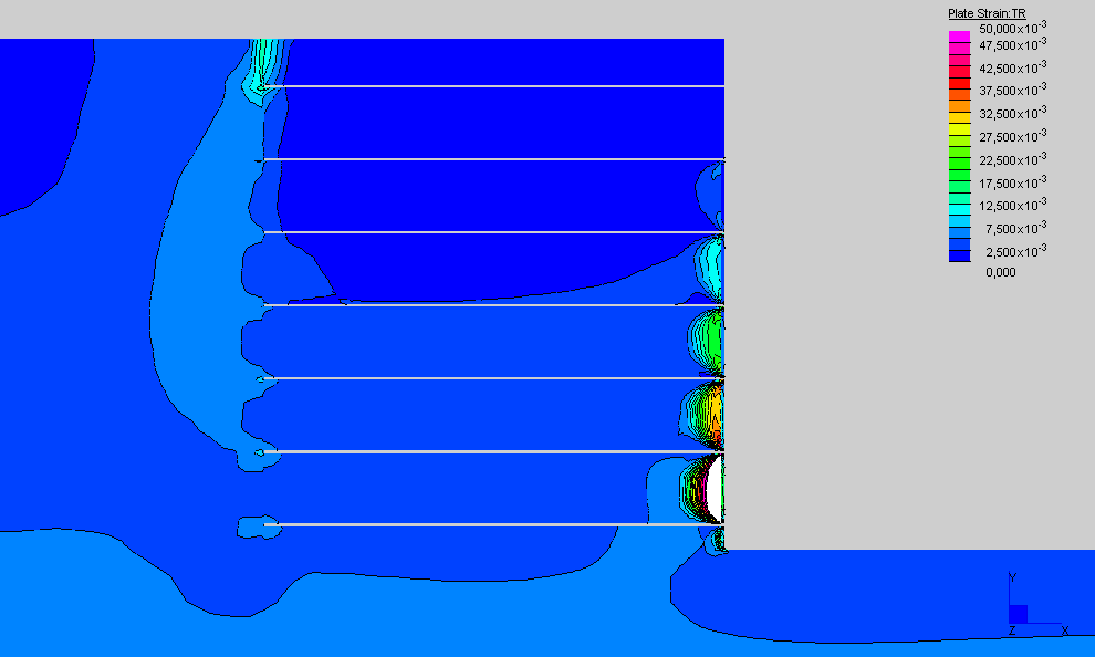 Aumentando la rigidezza dei chiodi di due ordini di grandezza (Rn = 10) non si fa più la formazione di una banda di taglio, rimangono tuttavia delle zone di terreno plasticizzato a tergo della zona chiodata dovute alla spinta ribaltante.