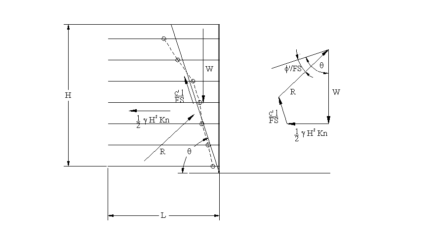 La sicurezza della struttura è stata valutata attraverso l’equilibrio limite di un cuneo di terreno potenzialmente instabile individuato da un piano che interpola i punti di massima trazione nei chiodi.