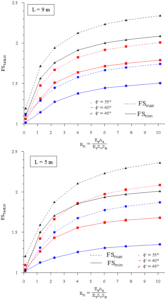Il fattore di sicurezza nei confronti di questa instabilità è rappresentato nei seguenti diagrammi e dipende dalla rigidezza relativa del chiodo rispetto al terreno.